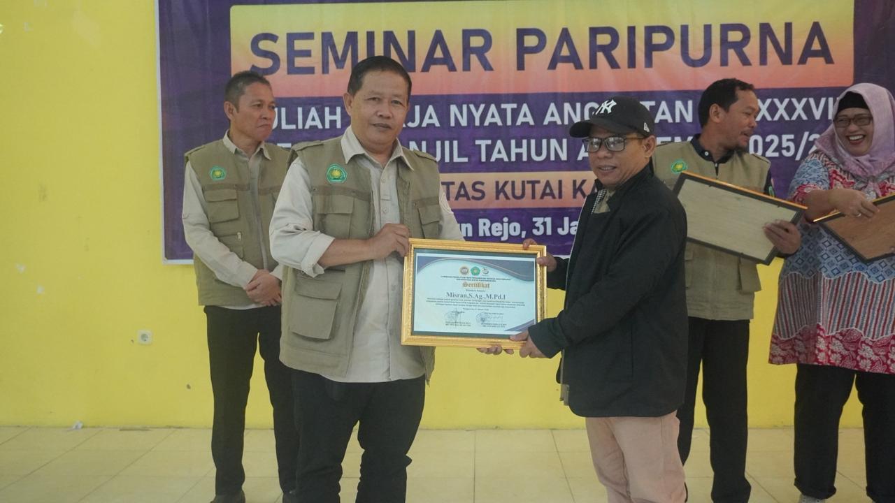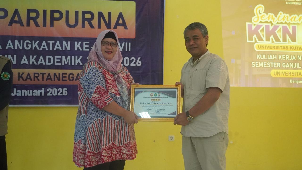 Selain pemaparan hasil kegiatan, acara juga diisi dengan penyerahan sertifikat penghargaan dari kampus kepada para Dosen Pembimbing Lapangan (DPL) dan perwakilan Kepala Desa. Apresiasi tersebut diberikan sebagai bentuk terima kasih atas pendampingan dan dukungan yang telah diberikan kepada mahasiswa selama 45 hari KKN berlangsung.